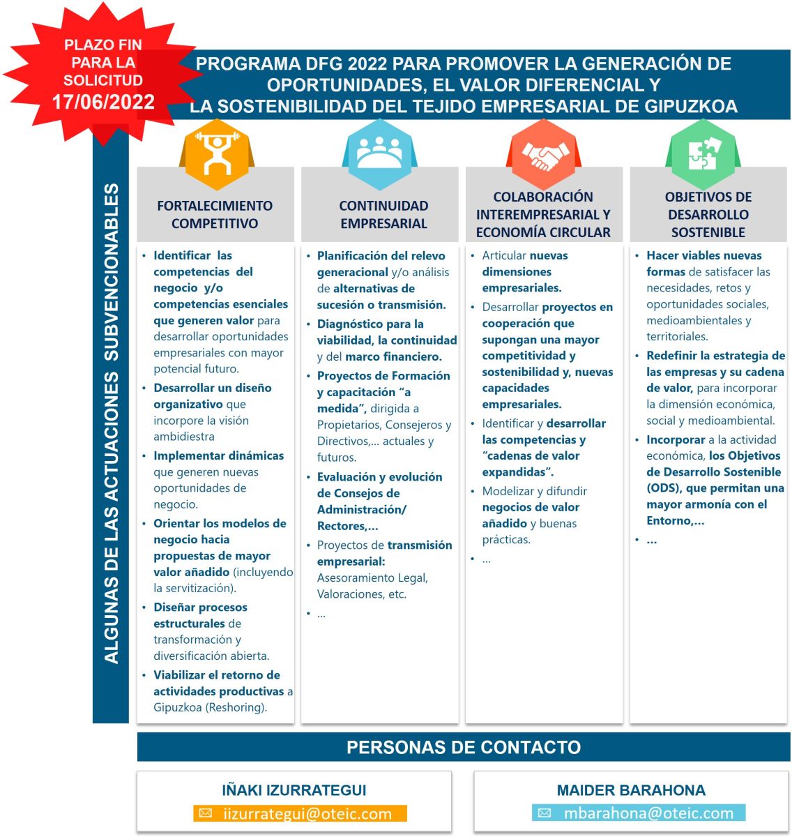 Les informamos sobre los nuevos Programas de Diputación Foral de Gipuzkoa 2022, que subvencionan Proyectos para PROMOVER LA GENERACIÓN DE OPORTUNIDADES, EL VALOR DIFERENCIAL Y LA SOSTENIBILIDAD DEL TEJIDO EMPRESARIAL DE GIPUZKOA, en base al siguiente esquema orientativo de tipos de Actuaciones Subvencionables y Líneas de Ayuda en las que se podrían enmarcar: