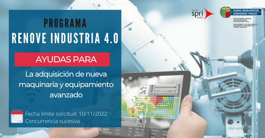 Les informamos sobre el Programa RENOVE INDUSTRIA 4.0orientado a fomentar las inversiones en nueva maquinaria y equipamiento avanzado (hardware y software), con el objetivo de modernizar los entornos industriales para que puedan abordar los retos de la Industria 4.0, a través de dos líneas de actuación: