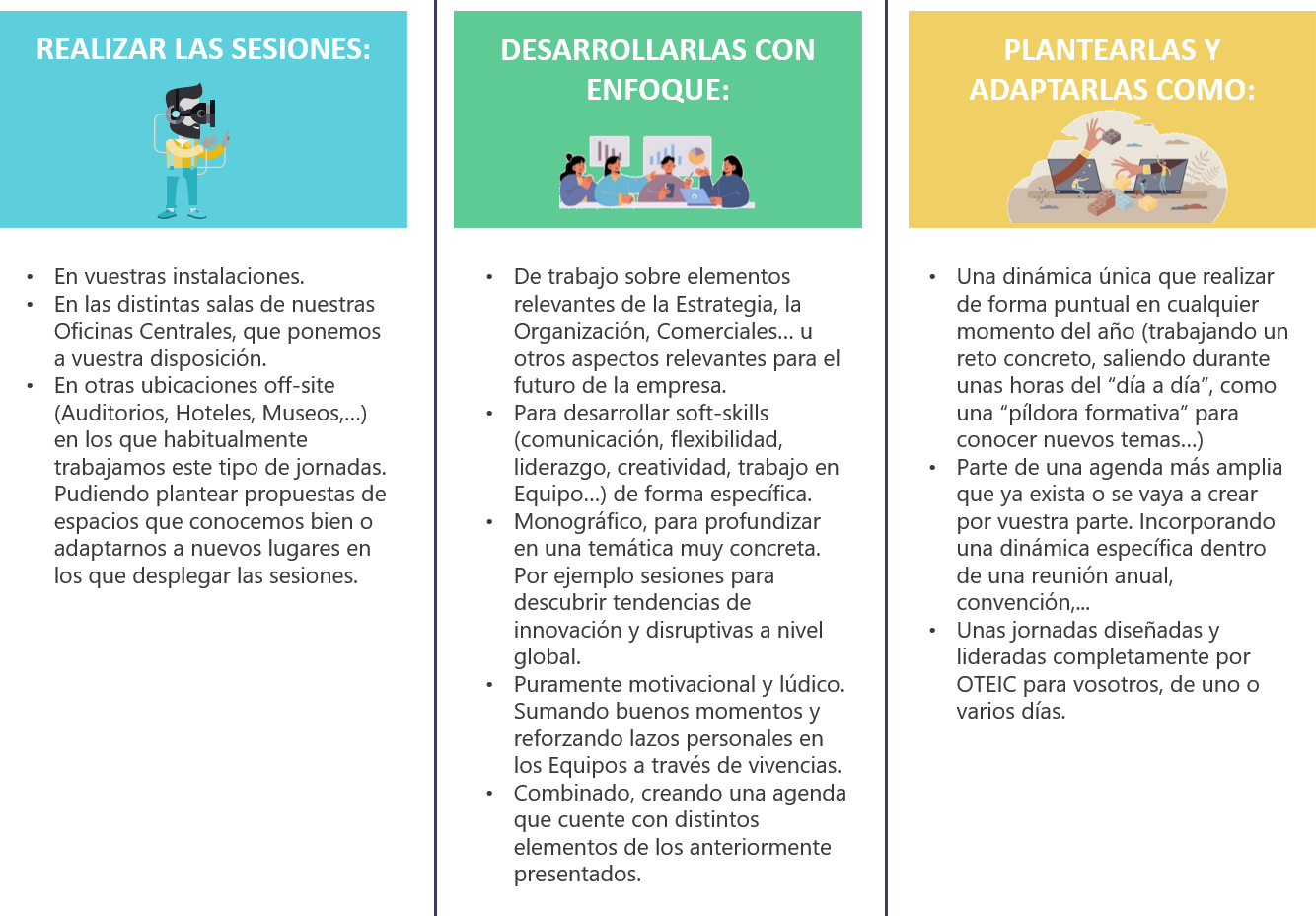 Utilizamos diversas metodologías e incorporamos un abanico de dinámicas que pueden albergar desde ejercicios más cercanos a la estrategia, retos comerciales, desarrollo profesional y personal,… hasta otros más lúdicos y divertidos, dependiendo del enfoque de la sesión.